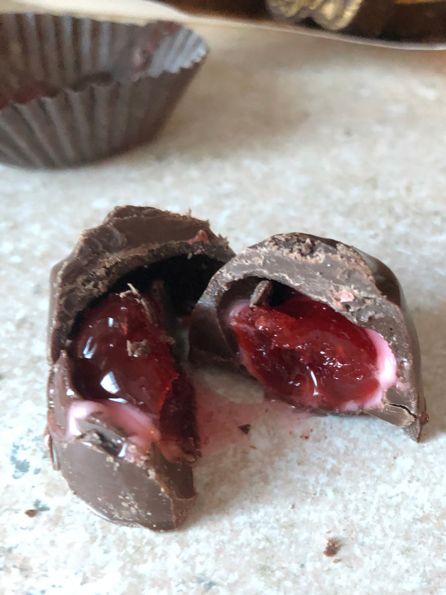 Use a Candy Island Mold like #500 (Classic Maraschino Cherry), # 113 Cherry Blossom (large cherry designed for chopped pecans at the bottom) or #880 (Rose Cherry) then coat the mold with molding chocolate, put in freezer for 5 minutes. While that is setting mix 1/4 teaspoon of Cherry juice (from the jar) and 2 tablespoons of Fondant Powder until you get a thick liquid. Take the Maraschino cherry out of the freezer and put a 1/4 tsp of the fondant mixture in the bottom and small maraschino cherry. Now cover the cherry with chocolate making sure the edges are sealed. Place in freezer for at least 15 minutes. People will be amazed you made these yourself.